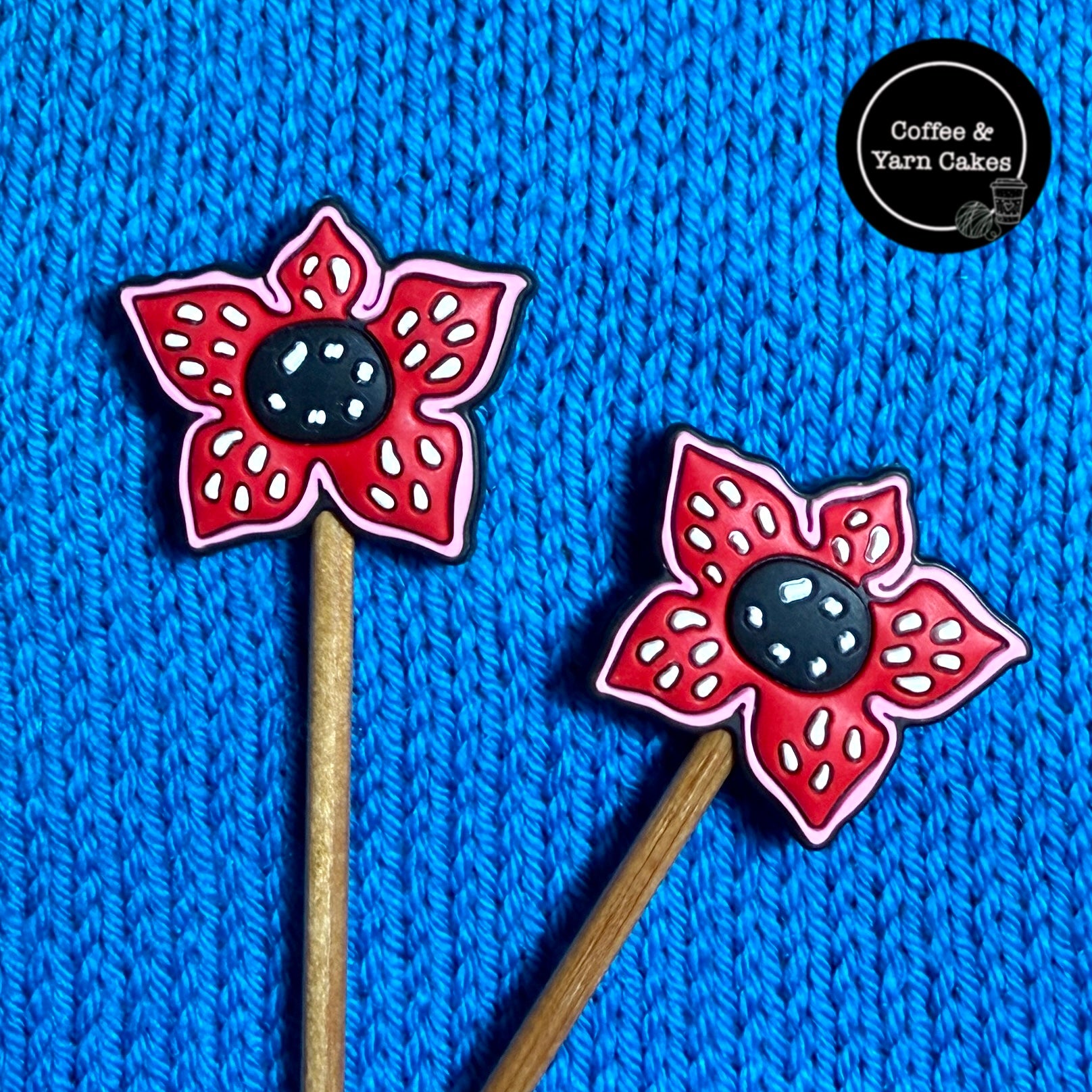 A pair of silicone stitch stoppers to stop your stitches sliding off and to add a Hawkins touch to your WIP